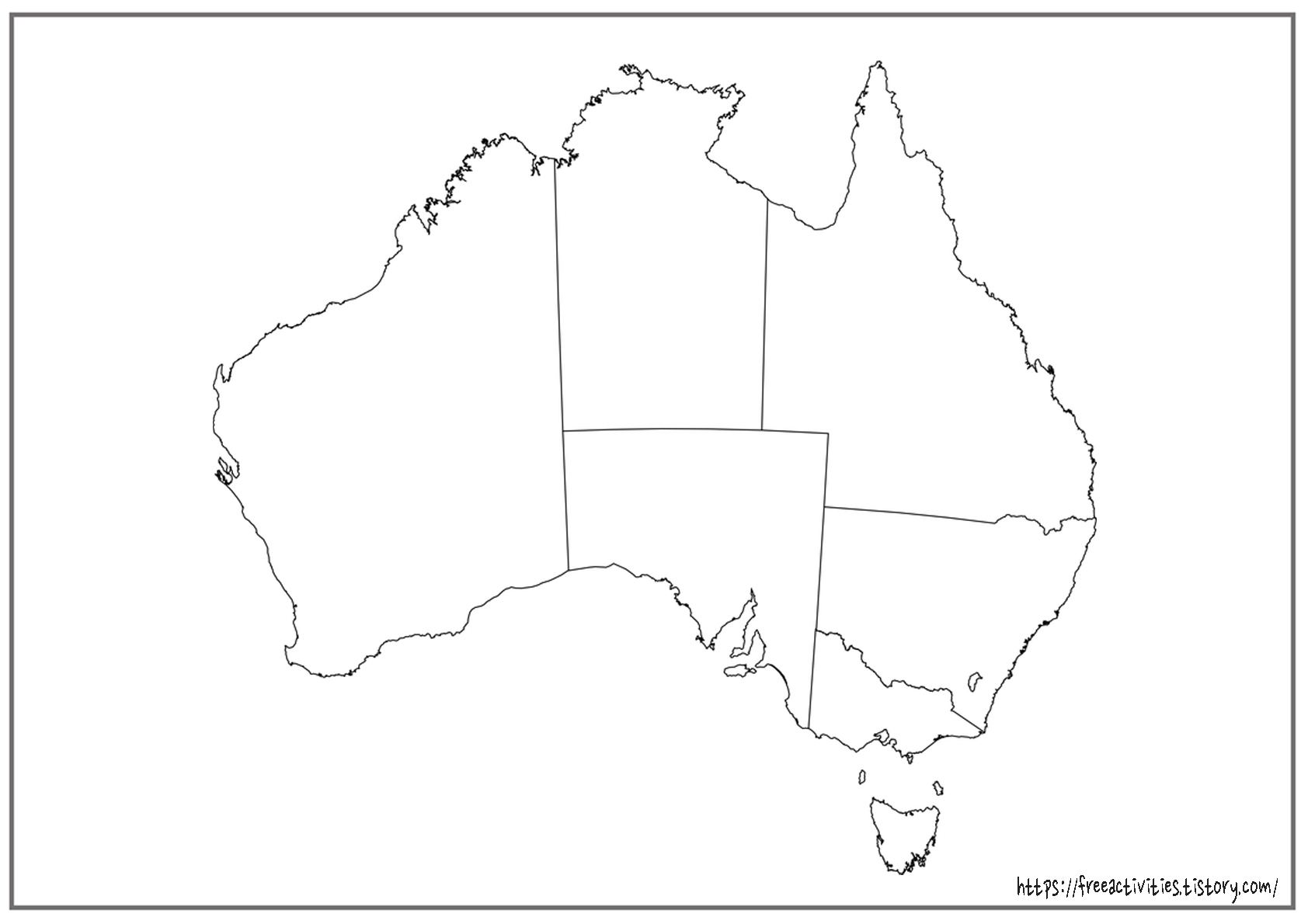 계속되는 지도 시리즈로 이번에는 오스트레일리아(호주) 지도의 컬러링 도안을 준비하였습니다. 제가 살고 있는 캐나다도 땅은 넓어도 미국만큼 주가 많이 없어서 단순한데 오스트레일리아는 훨씬 더 단순하네요. 초등학생들 뿐만 아니라 고국에서 기러기 생활을 하시는 아빠들도 가족들을 생각하면서 색칠하기 좋지 않을까 혼자서 생각해 봅니다.